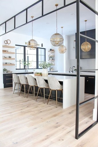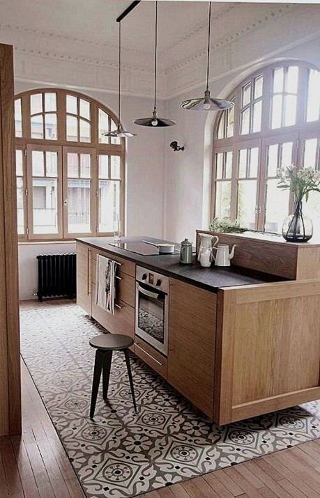 این کاشیهای کف، کف ایدهآلی را برای آشپزخانه فراهم میکنند. محکم و تمیز کردن آن آسان است، جایی که بیشترین نیاز به آن وجود دارد. در حالی که بقیه خانه روی یک کفپوش چوبی زیبا قرار دارد، قسمت جزیره دارای یک کاشی طرحدار است. این کار به قسمتهای پخت و پز و شستشو محافظت بیشتری میدهد. همچنین جزیره زیبای آشپزخانه را برجسته میکند.