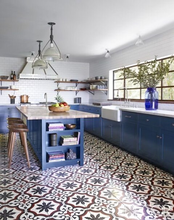 جذابیتها و گرمای طبیعت روستایی با سبکی شیک و جاودانه ترکیب شده است. این آشپزخانهی روستاییِ جادار و روشن، تم آبی و سفید دارد. دیوارهای تمیز و طراحی مینیمالیستی آن با سبکی مدرن هماهنگ شدهاند. کف کاشیهای طرحدار و رنگارنگ آن، به آشپزخانه شخصیت و جذابیت زیادی بخشیده است.