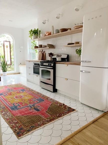 این آشپزخانه روشن و کلاسیک دارای تم تماماً سفید است - دیوارها، سقف، کف و بیشتر لوازم خانگی سفید هستند. تزئینات چوبی و فرش طرحدار روشن به اتاق رنگ میدهند. طرح گوشماهی کف سرامیکی، جزئیات و جذابیت جالبی به آشپزخانه میبخشد.
