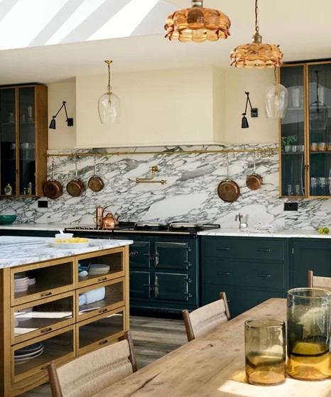 به براق بودن این کابینتهای آشپزخانه نیز توجه کنید. این یک روند عظیم است که برای سال ۲۰۲۵ دوباره رواج پیدا میکند. رنگهای جواهری غنی یا سایههای گوتیک عمیق در روکشهای بسیار براق واقعاً در حال رواج هستند و ببینید که در واقع، آنها آنقدر که به نظر میرسند چشمگیر نیستند. در اینجا، در ترکیب با یک جزیره آشپزخانه چوبی و جزئیات روستیک، براق بودن زیاد، حس خانه سنتی را القا میکند .بسیار غیرمنتظره و بسیار شیک.